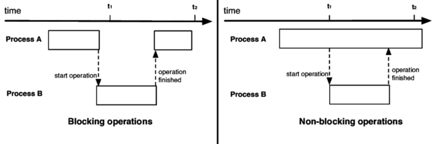 | 설명 | A가 B를 호출했을 때, A가 B의 결과를 기다리는가 | A가 B를 호출했을 때, A가 막히는가 |