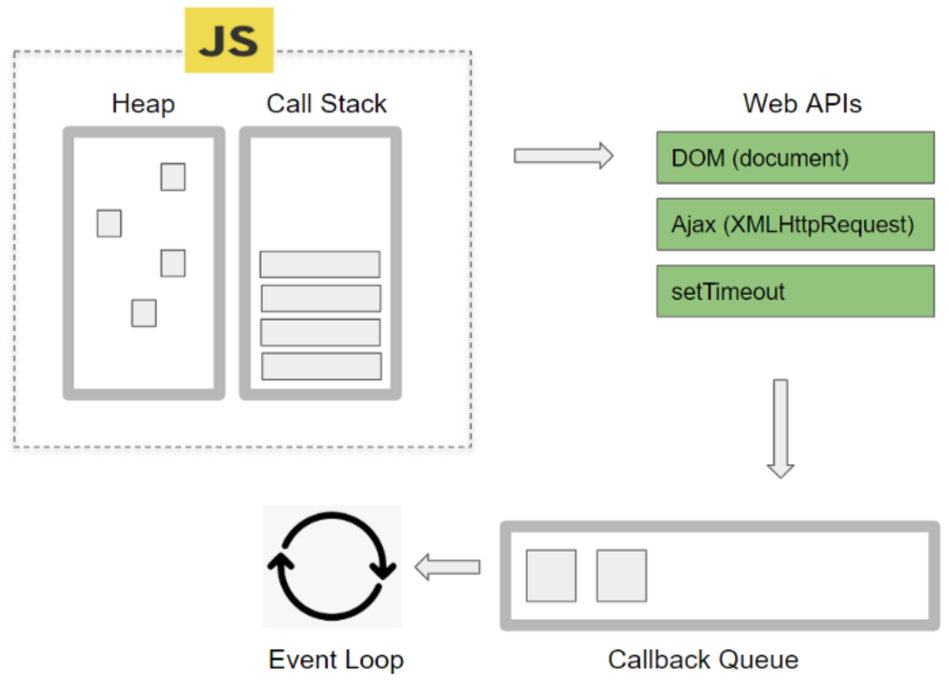 WebAPIs: 브라우저에서 제공하는 API로 비동기적으로 실행되는 작업들을 전담하여 처리한다. DOM, Ajax, 타이머 함수 등이 있다. Callback 함수를 Callback Queue에 넣는다.
