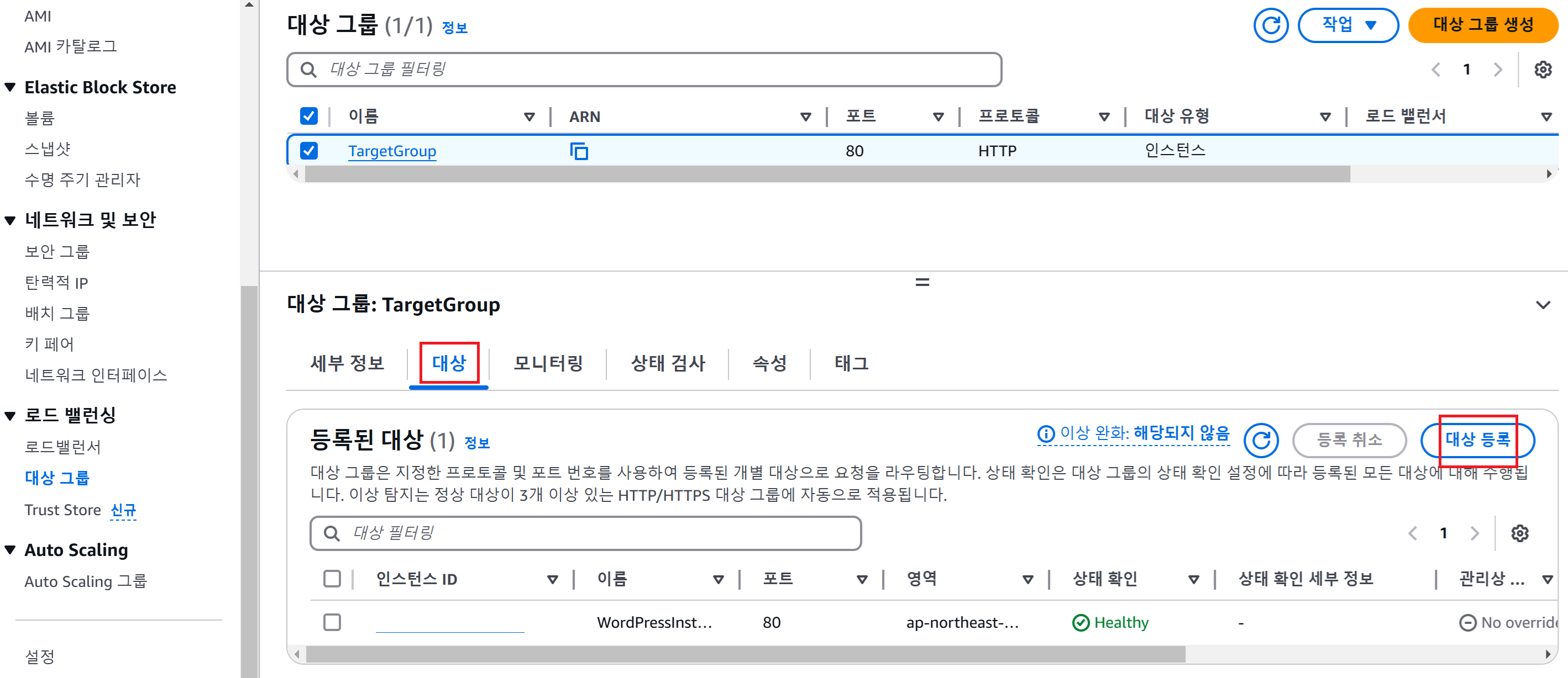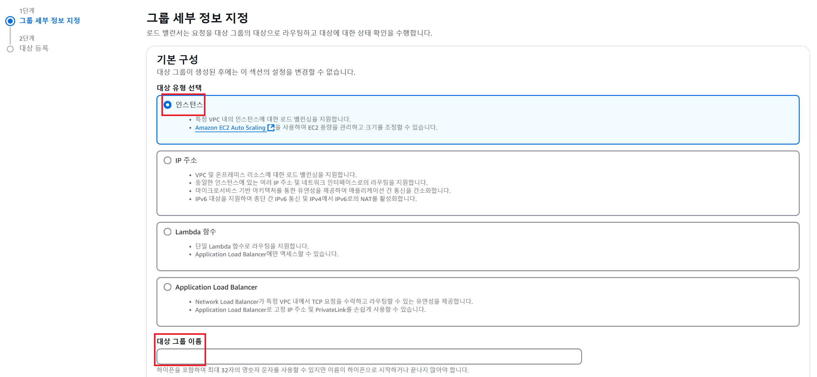대상 그룹(Target group) : 부하를 분산시킬 대상 인스턴스들이 속한 그룹 (EC2의 각종 정보, 헬스 체크, 모니터링 기능)