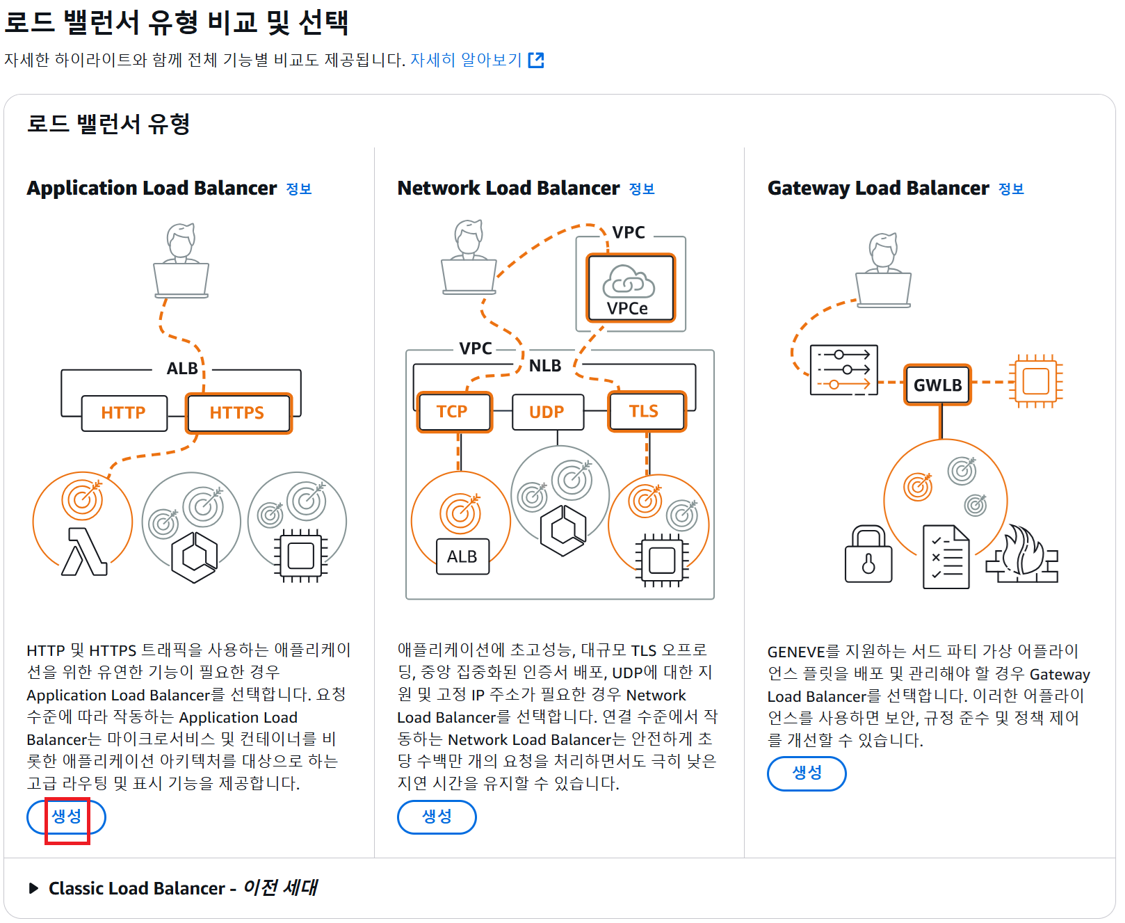 ALB(Application Load Balancer) : 요청 수준에서 작동하는 Load Balancer, HTTP/HTTPS 트래픽 사용 애플리케이션을 위한 유연한 기능 제공 (웹 화면 요청 등)