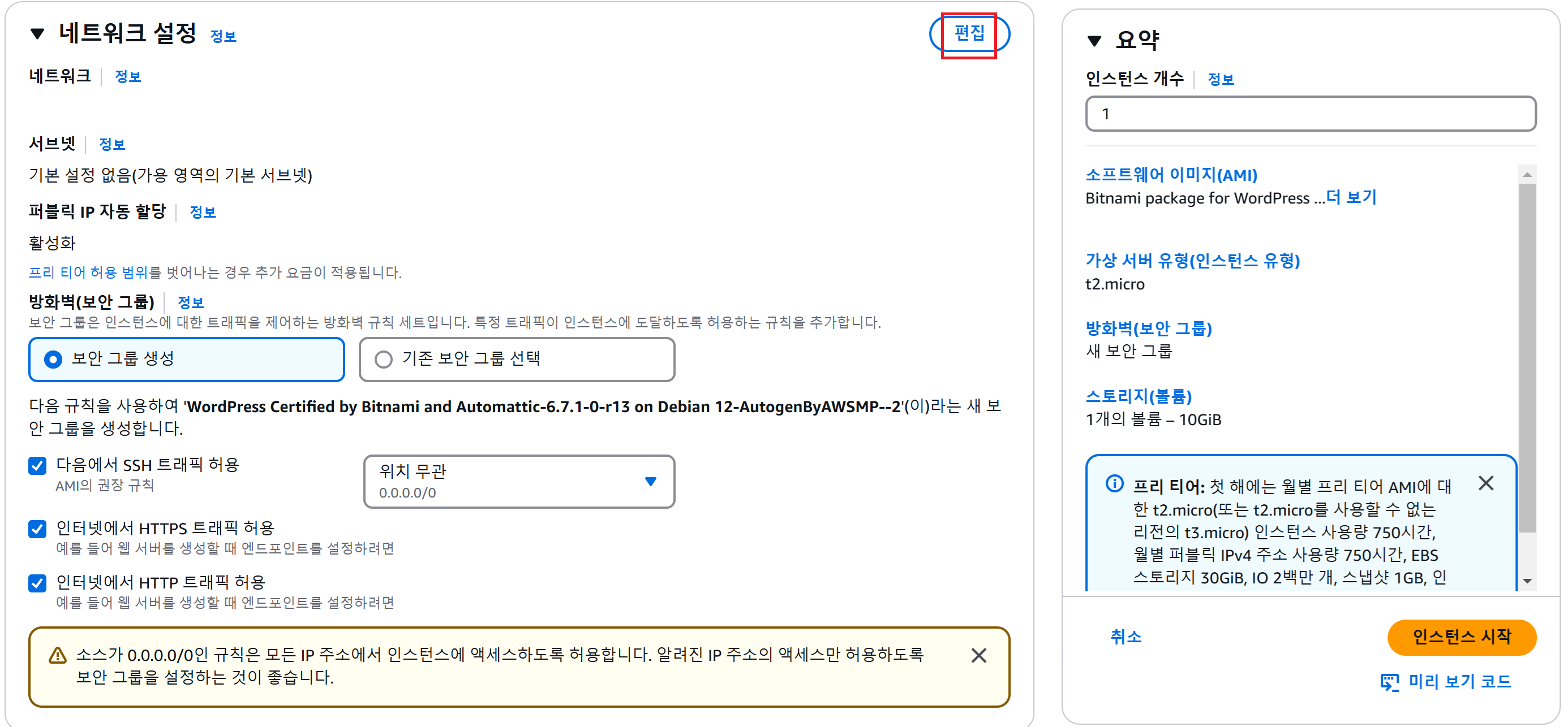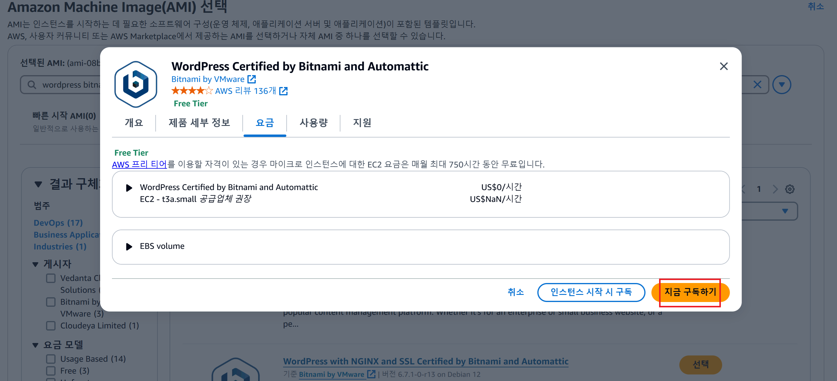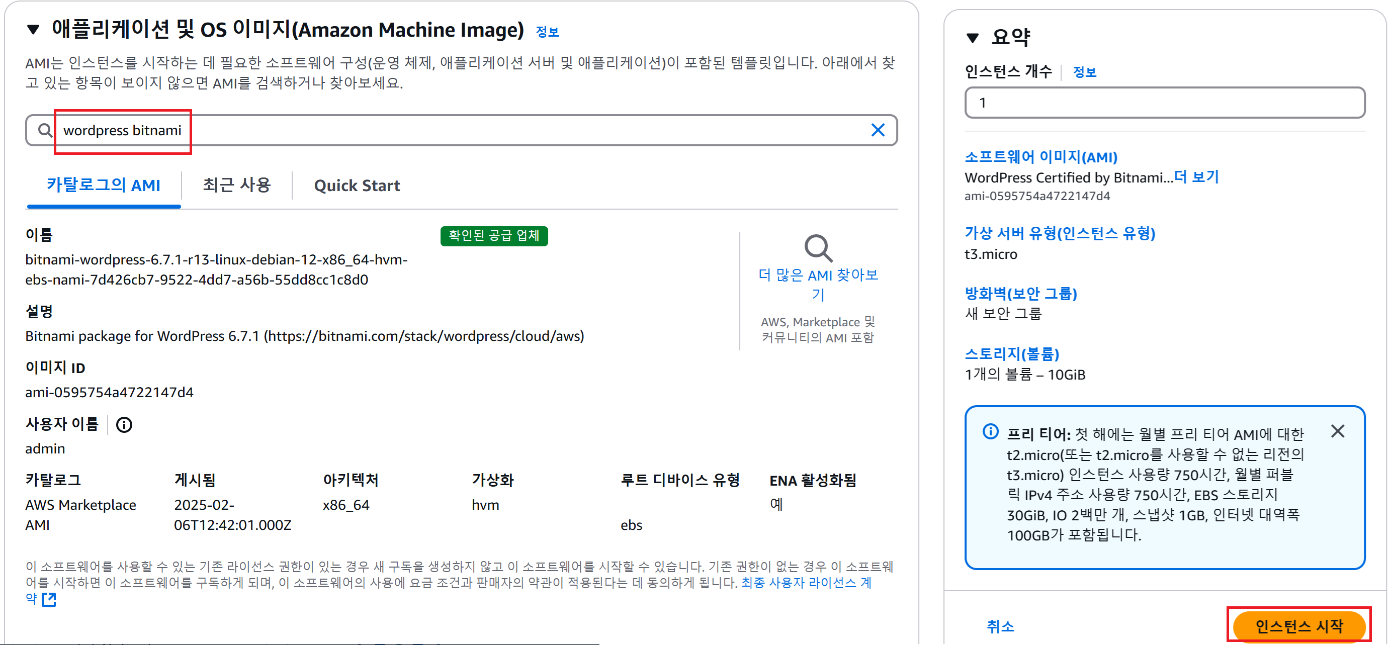 EC2 인스턴스 시작 → AMI WordPress Certified by Bitnami and Automattic, 인스턴스 유형 프리 티어 → 인스턴스 생성 후 퍼블릭 IPv4 주소로 접속