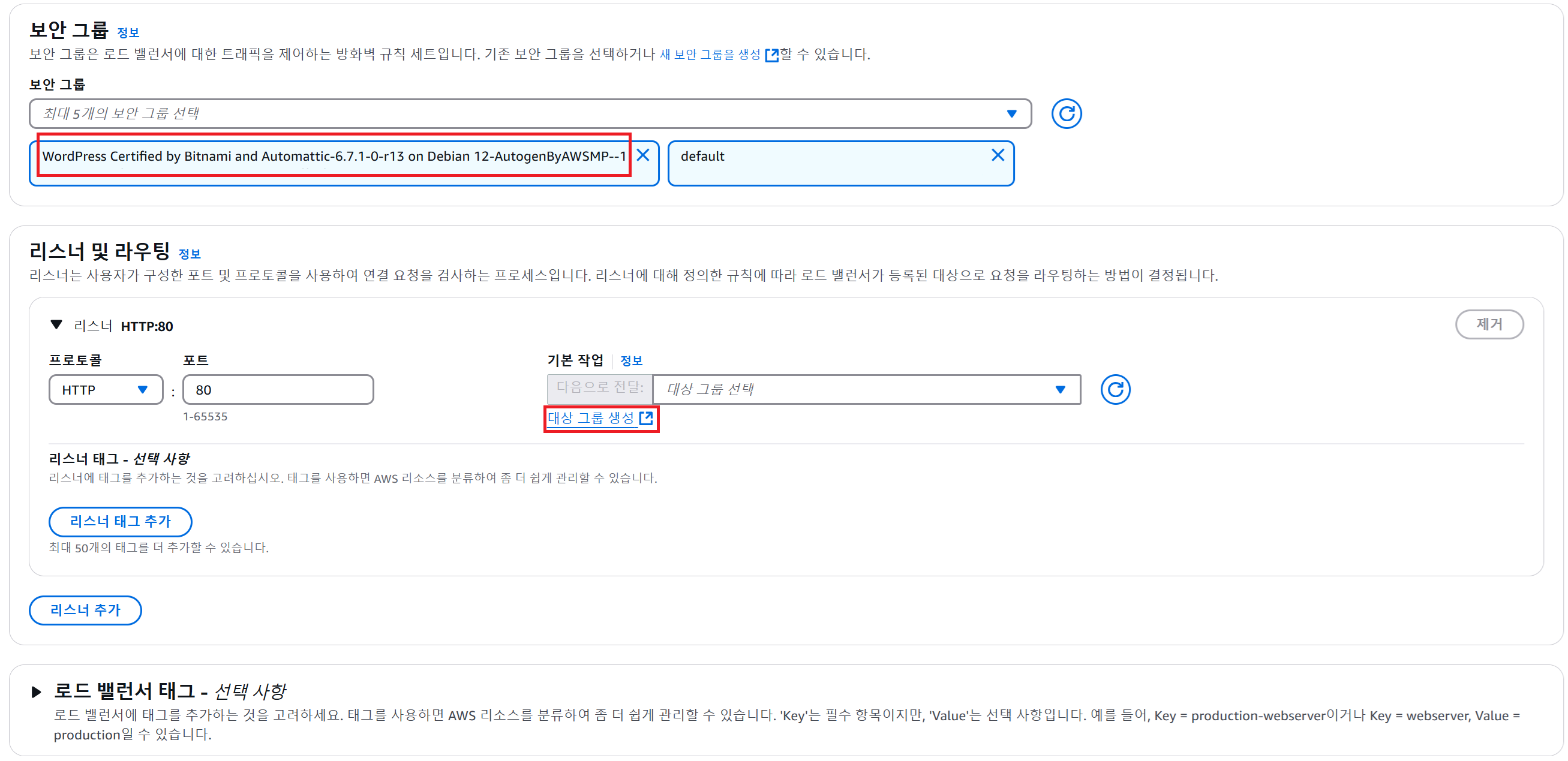 보안 그룹은 로드 밸랜서로 들어오고 나가는 트래픽에 대한 가상의 방화벽 (외부에서 ELB를 통해 WordPress 인스턴스로 접속할 수 있도록 설정)