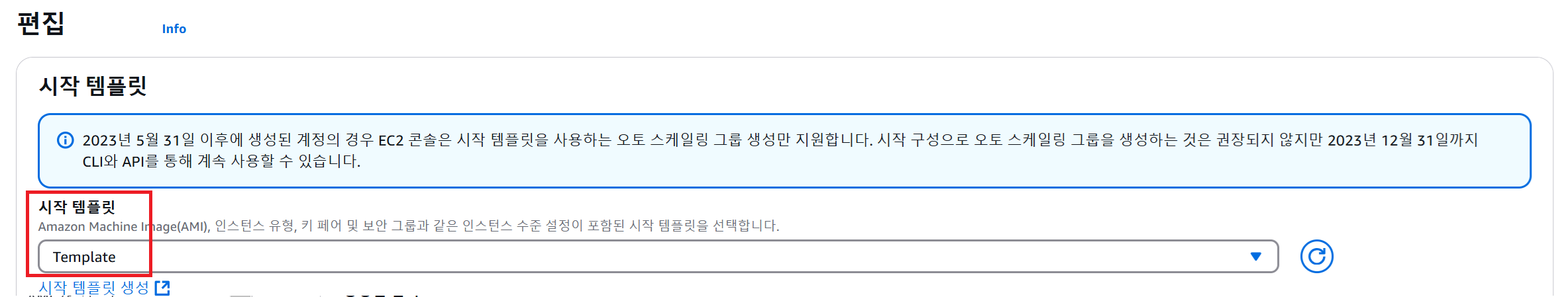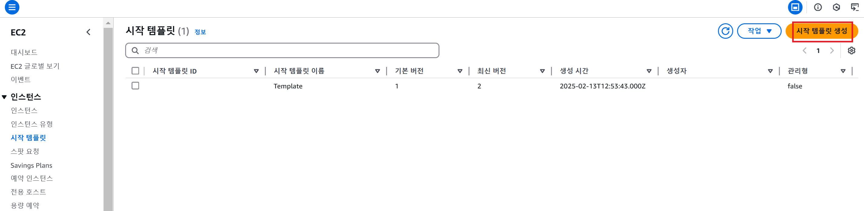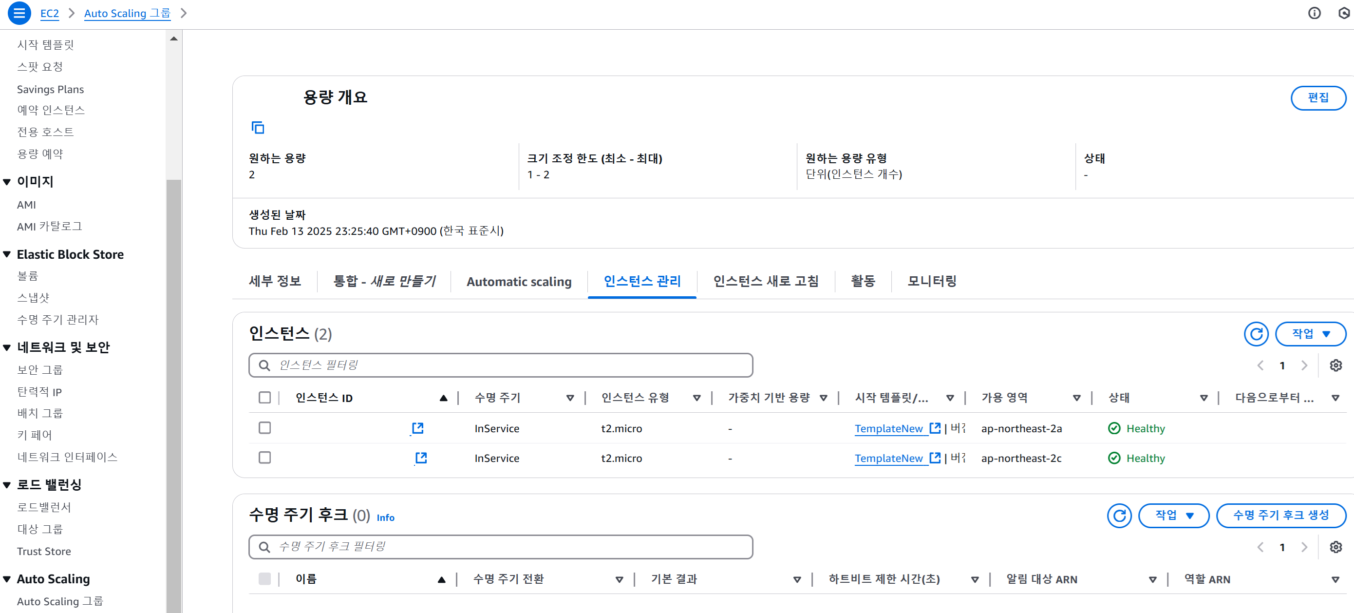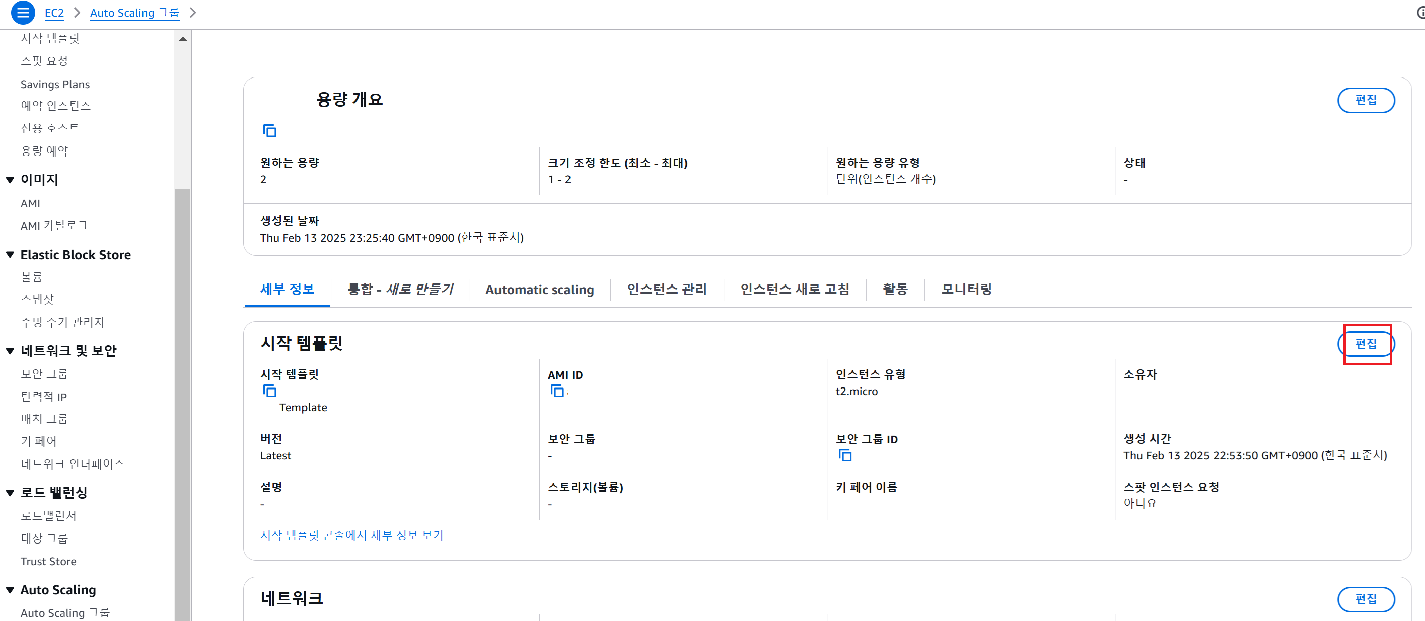 이후 Auto Scaling 그룹의 최소 인스턴스 개수를 맞추기 위해 인스턴스가 자동으로 생성됨 (새로운 시작 템플릿으로 생성된 EC2 인스턴스)