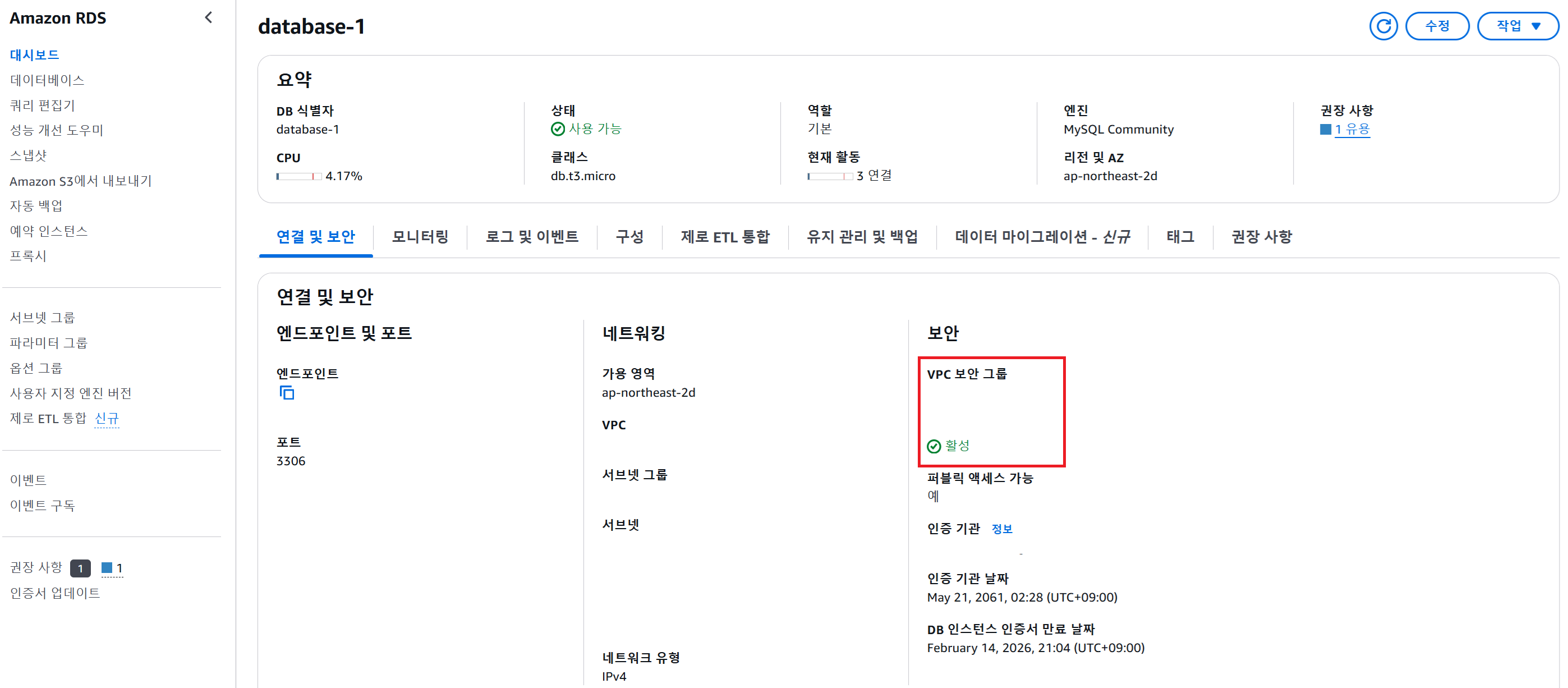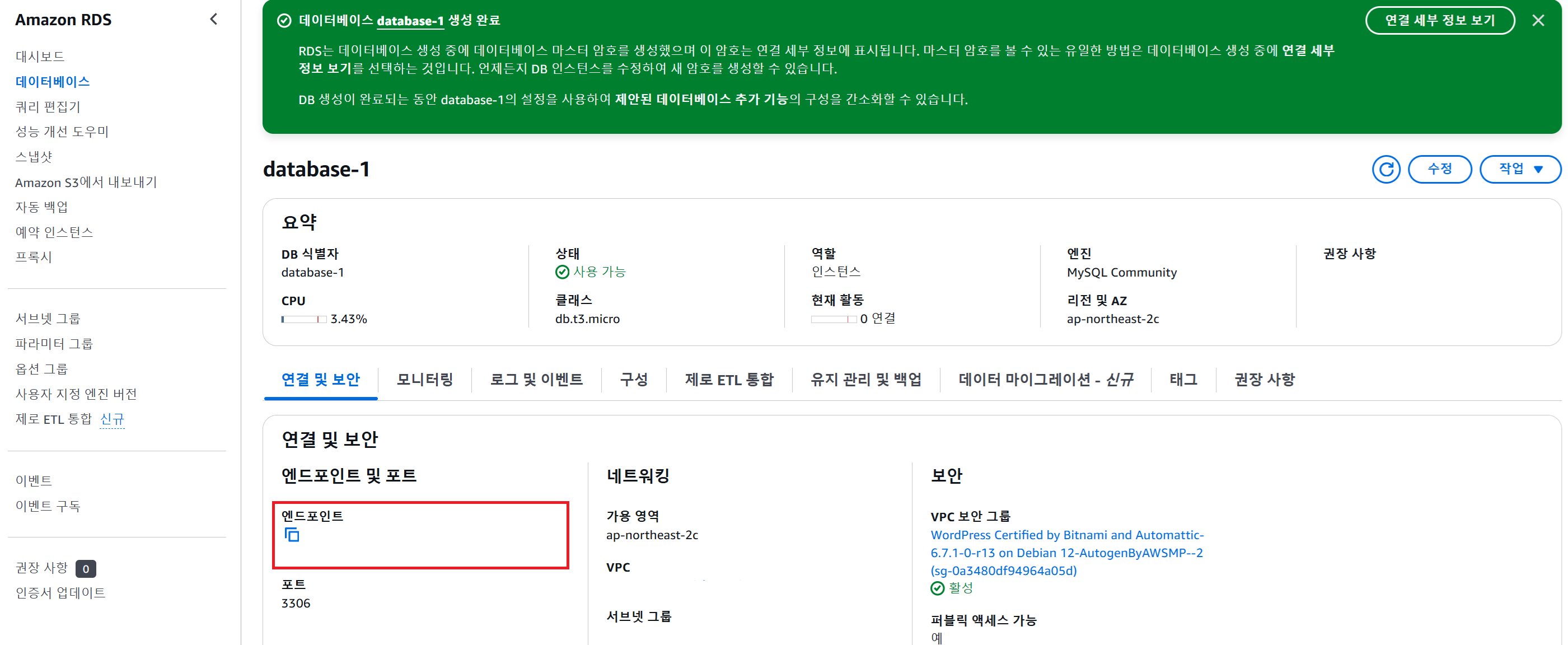 엔드포인트는 DB 인스턴스에 접속하기 위한 주소