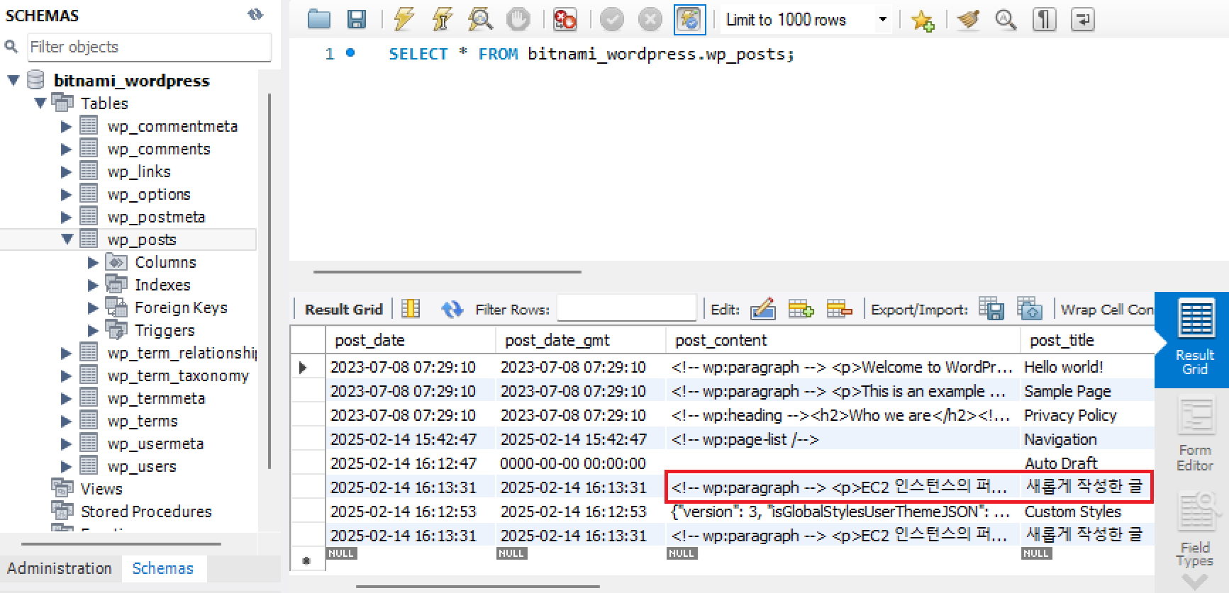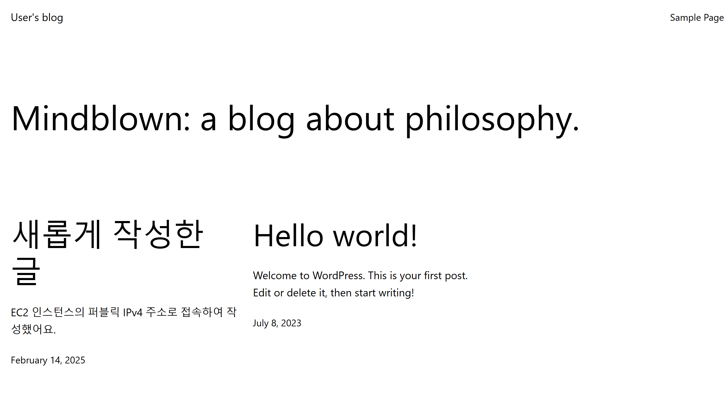 실행 중인 인스턴스 중 하나를 선택하여 글 작성 (퍼블릭 IPv4 주소/admin 접속, 사용자 이름 user, 비밀번호 1234)