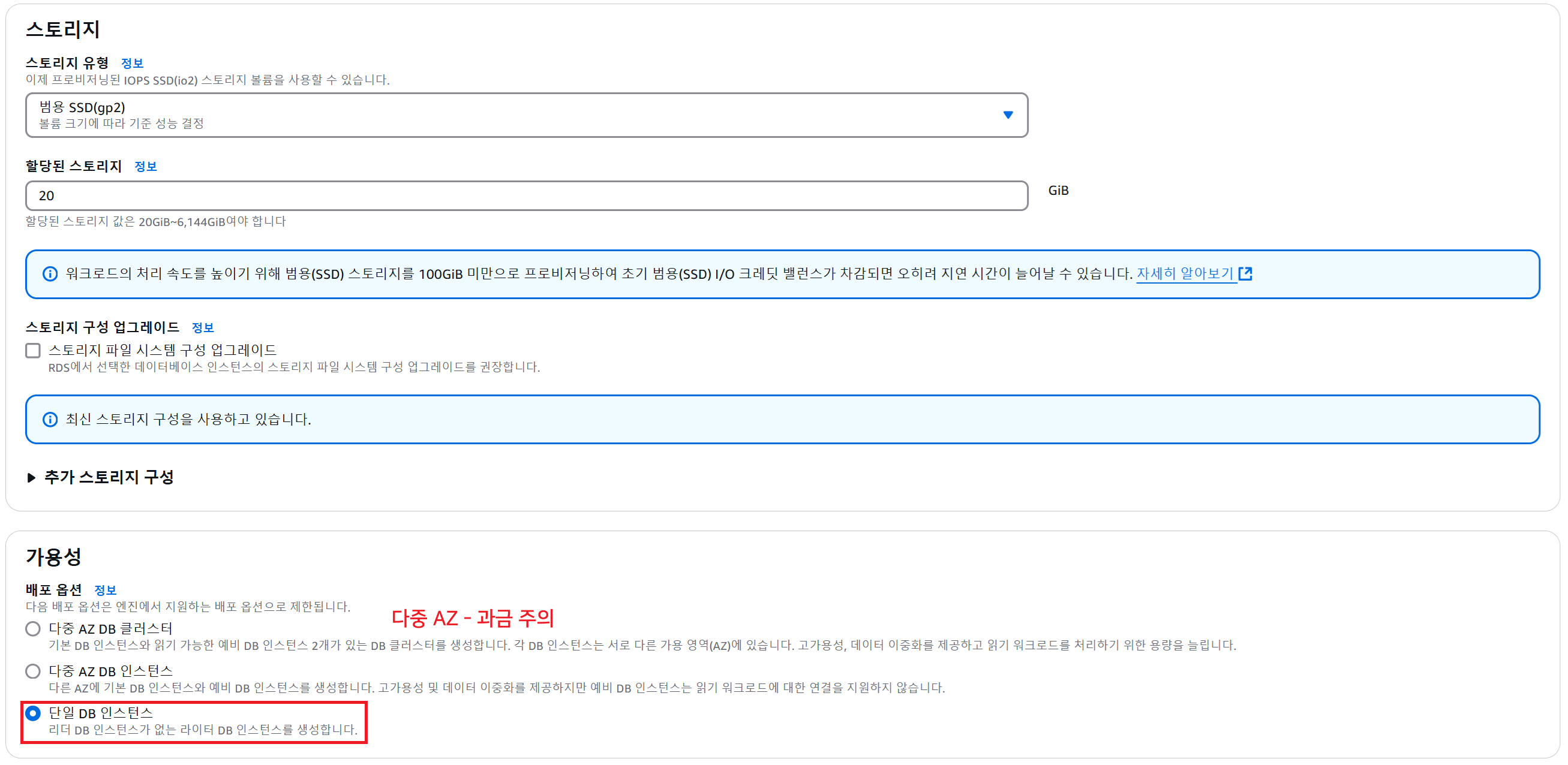 Multi-AZ : 단일 지역 내 항상 2개 이상의 가용 영역에 걸쳐 데이터베이스 구축 (안정성), 접근 불가