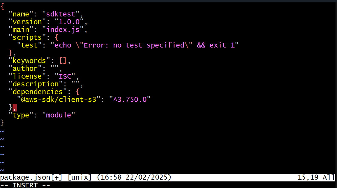vim package.json → 마지막 줄에 "type": "module" 추가