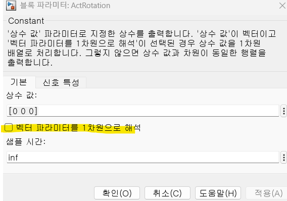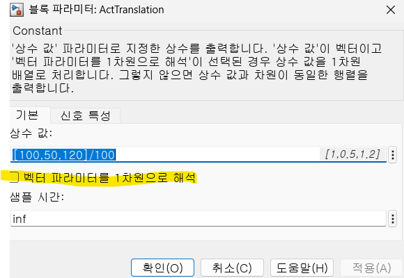 e) Constant: 상수값 또는 행렬값을 넣어주기위한 블럭. 여기서는 Simulation 3D Actor Transform Set에 인자로서 카메라의 위치, 회전, 크기값을 행렬로서 넣어주기 위해 사용하였다.