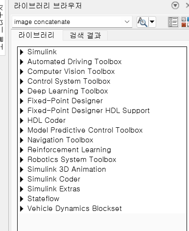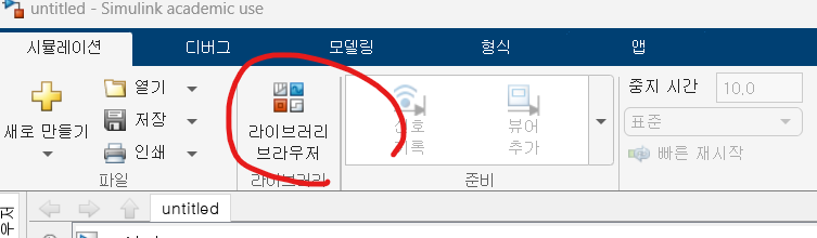 브라우저 라이브러리: Simulink 기본 블럭들과, Add on으로 받은 애드온 블럭들이 있다.