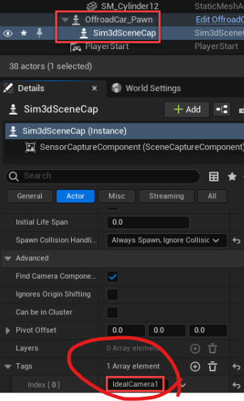 차량에 부착한 카메라 엑터를 Simulink가 인식하게 하기 위해서는 Tag를 설정해줘야한다. 이 이름을 가지고 Simulink 블록이 UE의 카메라 액터를 찾으니 잘 지정하자.