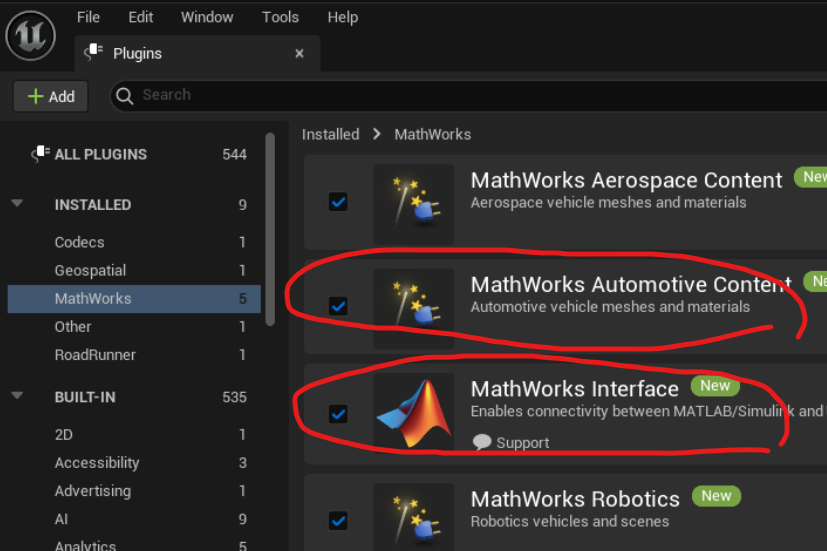 ⚠️체크하고 나면 재시작하라고 하는데, 재시작 하면 에러난다! 왜냐하면 매틀랩 플러그인을 등록한 프로젝트인데, simulink 블럭을 통해 프로젝트를 오픈하지 않아서 그렇다!! 그냥 체크하고 UE 끄면된다.