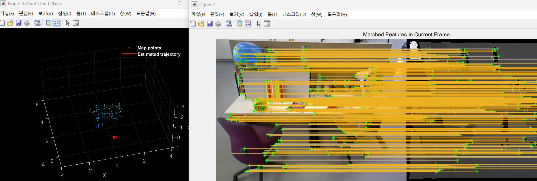 ์ธ์ ํ ํ๋ ์๊ฐ ๋น๋งค์นญ๋ ํฌ์ธํธ๋ค๋ ์ฐ๊ฒฐํ์ฌ SLAM ๊ณผ์ ์ ์ด์ฉ.