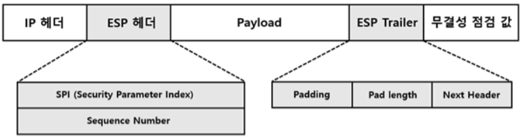 선택한 IPSec 모드에 따라, 보안 페이로드 캡슐화 프로토콜 (ESP)은 전체 IP 패킷 또는 페이로드에 대해서만 암호화를 수행한다. ESP는 암호화 시 데이터 패킷에 헤더와 트레일러를 추가한다.