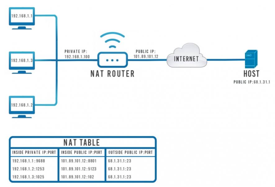 공인 IP는 같지만, 포트 번호를 다르게 할당하여 각각의 호스트를 구분짓는 구조이다. 회사의 대표 번호를 사용하면서, 내선 번호를 지정한 것과 유사한 시스템이다. 이를 통해, 외부로 통신을 내보내고, 이에 대해 받은 네트워크 응답을 다시 해당 호스트에 보내준다. 따라서, 사설 IP를 사용하는 호스트들이 외부에서 봤을 때에는 (웹 서버가 보았을 때) 같은 클라이언트같지만, 각각의 웹 서핑이 가능한 구조가 될 수 있다.