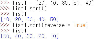 이 메소드는 리스트 변수 뒤에 마침표와 sort()를 적어주면 다음과 같이 항목들을 오름차순과 내림차순으로 정렬이 가능해진다. 이 때, 리스트 변수 list1의 메소드 sort()를 호출하면 변수 안의 항목들을 [10, 20, 30, 40, 50]과 같이 증가하게 된다.