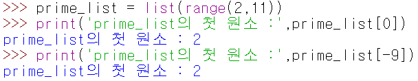 1. 2부터 10까지의 수중에서 소수를 원소로 가지는 prime_list라는 리스트를 생성해라. 그리고 이 리스트의 가정 첫 원소를 리스트 인덱싱을 이용하여 다음과 같이 출력하여라.