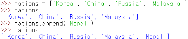 2. 'Korea', 'China', 'Russia', 'Malaysia' 라는 국가 이름을 원소로 가지는 nations라는 리스트에 append() 메소드를 사용하여 'Nepal'을 추가하시오. 이 때 추가 전과 추가 후의 결과를 출력하시오.