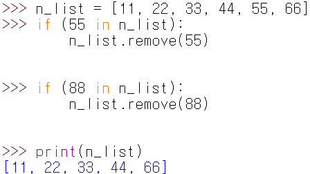 프로그램을 보면 n_list 변수에 해당하는 값이 있는지 확인하기 위해 in 연산을 사용하고 반환하는 값을 if문의 조건식에 넣어서 True를 반환하면 삭제를 실행하고 아니면 실행하지 않도록 하였다.