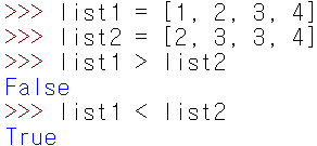 위 프로그램은 1,2,3,4 와 2,3,3,4 이기 때문에, list1이 사전적 순서에 의해 먼저 나타난다. 따라서 list1 > list는 거짓, list1 < list2는 참이다.