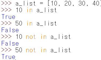파이썬은 리스트나 딕셔너리, 튜플, 집합, 문자열과 같이 여러개의 항목을 가지는 자료형을 제공하는데, 이 자료형 내에 특정 항목 값이 포함되어 있는가를 묻는 연산자를 멤버 연산자라고 한다. 이는 참이나 거짓을 반환하는 연산자이다. 실습을 해보자.
