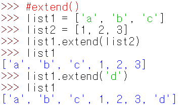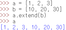 보다시피 append(b)를 하면 리스트가 통째로 a 리스트에 추가된다. 반면 extend(b)를 이용하면 인자만 옮겨지는 것을 볼 수 있다. 헷갈리지 않도록 유의하도록 하자.
