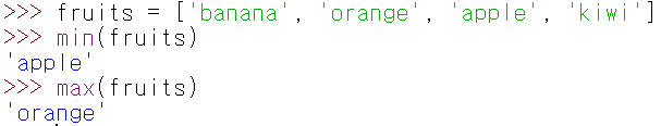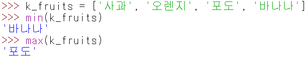 이렇게 리스트의 원소가 숫자가 아닌 문자열이 들어있는 리스트 변수에도 min(), max() 함수는 잘 작동되며, min()은 영어의 경우 사전 순서로 가장 앞에 나오는 단어, max()는 사전 순서로 가장 뒤에 나타나는 단어나 문자를 구한다. sum() 함수는 문자열에 대해 작동하지 않는다.