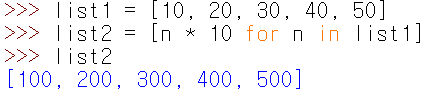 위 코드가 상대적으로 복잡하게 느껴졌다면 더 간단한 방법도 있다. 이 방법은 리스트의 축약 표현이라고 하는데, 대괄호 내에 있는 코드 for n in list1을 이용하여 list1의 모든 원소를 방문하여 n * 10 연산을 적용한 새로운 리스트를 얻을 수 있다.