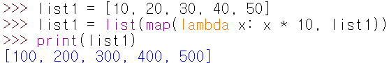 다음 방법은 map() 함수를 이용하여 리스트의 모든 원소에 대해 지정된 함수를 사상시키는 방법으로 이 예제에서는 lambda() 함수를 사용하였다.