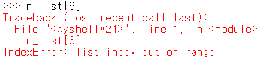 예를 들어 항목이 6개 들어있는 리스트 변수에 n_list[6]을 입력하면 n_list에 존재하지 않는 일곱번째 값에 접근하는 것이므로, 오류가 발생한다. 이에 대해 주의가 필요하다. 최대 인덱스는 len(n_list) - 1로 얻을 수 있다.