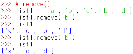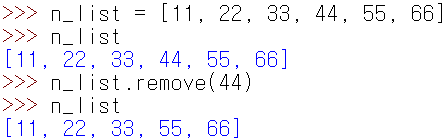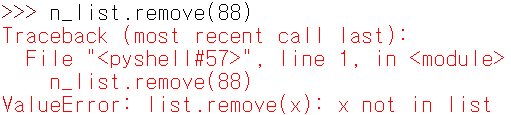 물론 없는 인자를 삭제하려고 입력하면 오류가 발생한다. 이러한 문제를 해결하기 위해 리스트의 멤버를 확인하는 등의 연산이 필요하다.
