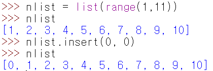 2. insert() 메소드를 사용하여 nlist의 제일 앞에 0을 삽입하여 다음과 같이 출력하여라.