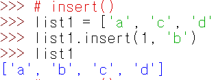 insert 함수는 앞에서 설명했듯이 인자를 넣을 위치를 설정하고 인자를 입력하는 것으로 사용한다.