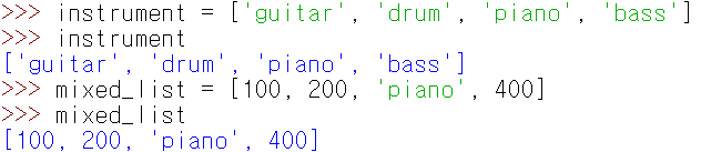 보다시피 instrument라는 리스트에는 문자열 네개를 한꺼번에 저장하고 출력하였다. 그리고 mixed_list에는 숫자와 문자를 동시에 저장하고 출력하는것이 가능하다는 것을 알 수 있다.