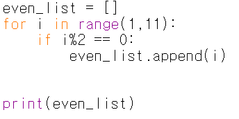 일단 even_list에 빈 리스트를 할당했다. 다음 for 문으로 1에서 10까지 반복하는 명령문을 적고, 내부에서 2로 나누었을 때 나머지가 없는, 즉, 짝수를 출력하는 명령을 하고나서, 그에 해당되는 수를 even_list에 append 메소드를 이용하여 집어 넣고, print() 함수로 출력하는 것으로 마무리 하였다.