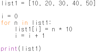 3장에서 for문을 통해 리스트의 항목을 하나하나씩 나열, 혹은 연산하는 기능을 보았다. 이제 10, 20, 30, 40, 50의 원소를 가지는 리스트가 있을 때, 모든 원소에 10을 곱한 값인 100, 200, 300, 400, 500의 원소를 가지는 리스트를 만들어 보자.