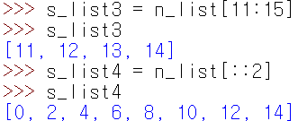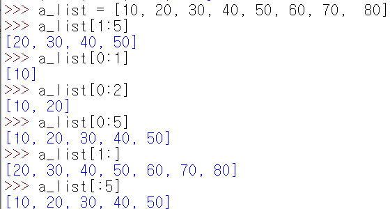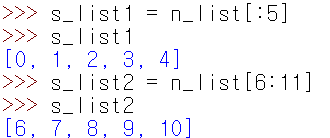 이 때 구간을 명시하기 위해 리스트 [start : end] 와 같은 문법을 사용하는데 end-1까지의 항목을 새 리스트에 삽입한다.