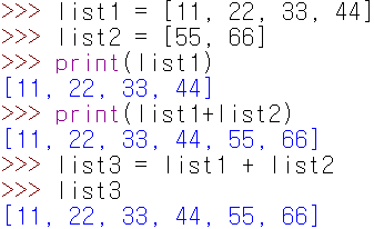list1 리스트에 list2 리스트를 더하기 연산자를 사용해 더하면 두 리스트 list1의 항목에 list2 항목을 추가하게 된다.