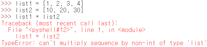 곱하기 2를 하면 리스트의 인자가 두번씩 나오고 3을 곱하면 3번씩 반환한다. 그러나 다음 프로그램은 오류를 발생시킨다.