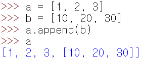 1. a 리스트의 원소 값이 [1,2,3]이고 b 리스트의 원소 값이 [10, 20, 30]이다. a 리스트에 append(b) 메소드와 extend(b) 메소드를 각각 호출할 때 어떤 결과가 나타날지 프로그램 해보시오.