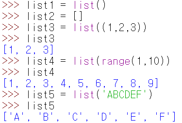 마지막 리스트 list5는 'ABCDEF'라는 문자열을 리스트로 변환하여 하나하나씩 쪼개어 요소로 하는 리스트를 생성했다.