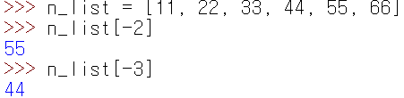 리스트 인덱싱의 큰 특징은 음수 인덱스를 사용할 수 있다는 점으로, C나 Java에서는 지원하지 않는다.