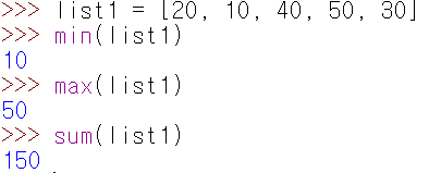 앞에서 min(), max(), sum() 같은 내장함수를 살펴보았는데, 이 함수들의 인자로 리스트를 넘겨주면 각각 리스트 안에서 최솟값, 최댓값, 합을 구할 수 있다.