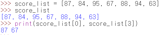 그리고 이 리스트는 첫번째 원소와 네번째 원소는 score_list[0], score_list[3]와 같이 인덱스를 이용하여 참조하면 된다.