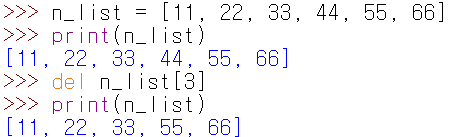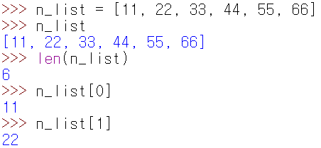 len 함수로 크기를 반환할 수 있다. 차례대로 11, 22, 33, 44, 55, 66 값이 저장되어있으므로 len(n_list)는 6을 출력하게 된다.