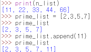 1. 1부터 10까지의 수 들 중에서 소수 원소를 가지는 prime_list라는 리스트를 생성하시오. 그리고 append() 메소드를 사용하여 11을 추가하시오. 이 때 추가 전과 추가 후의 결과를 출력하시오.
