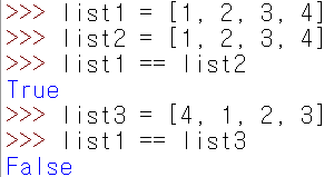비교 연산은 == 연산자로 할 수 있다. 인자도 같고 인자의 순서도 같은 list1과 list2를 비교하면 True라고 나오지만, list3은 다른 순서로 나열했기 때문에 False를 반환한다. 즉, 순서와 인자 모두 같아야 True를 반환한다는 것을 알 수 있다.