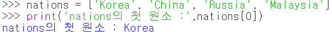 2. 'Korea', 'China', 'Russia', 'Malaysia' 를 원소로 가지는 nations라는 리스트를 생성하여라. 그리고 이 리스트의 가장 첫 원소를 print() 함수를 이용하여 출력하여라.