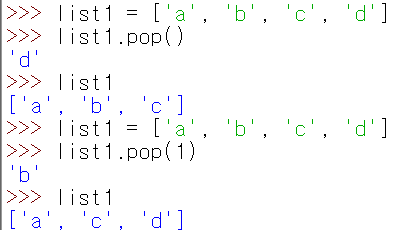 pop() 을 쓰고 괄호안에 아무것도 쓰지 않으면 맨 뒤의 인자가 삭제되어 반환되고, 아니면 삭제할 인자의 위치를 입력하는 것으로써 삭제할 수 있다. remove() 메소드와 비슷하지만 remove()는 삭제만 하고 반환은 하지 않는다.