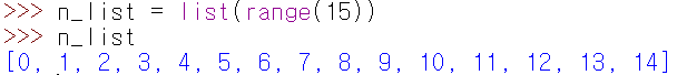 1. range(15) 함수를 사용하여 다음과 같은 리스트를 생성하여라.