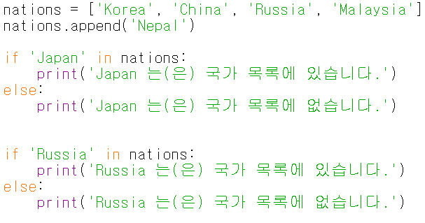 3. 앞 문제의 nations 라는 리스트에 'Japan'과 'Russia'가 있는지 없는지 검사하여 출력하시오. 존재 여부는 in 연산자, 출력시에는 if-else 조건문을 사용하시오.